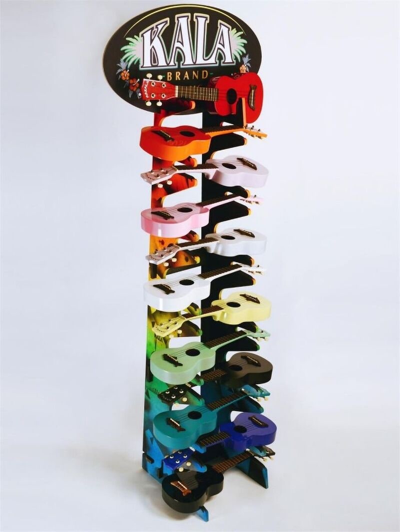This sturdy floor stand is designed to hold up to twelve ukuleles at once, making it suitable for stores, schools, studios, or larger collections. The construction provides stability and organized storage while keeping the instruments easily accessible and clearly visible.