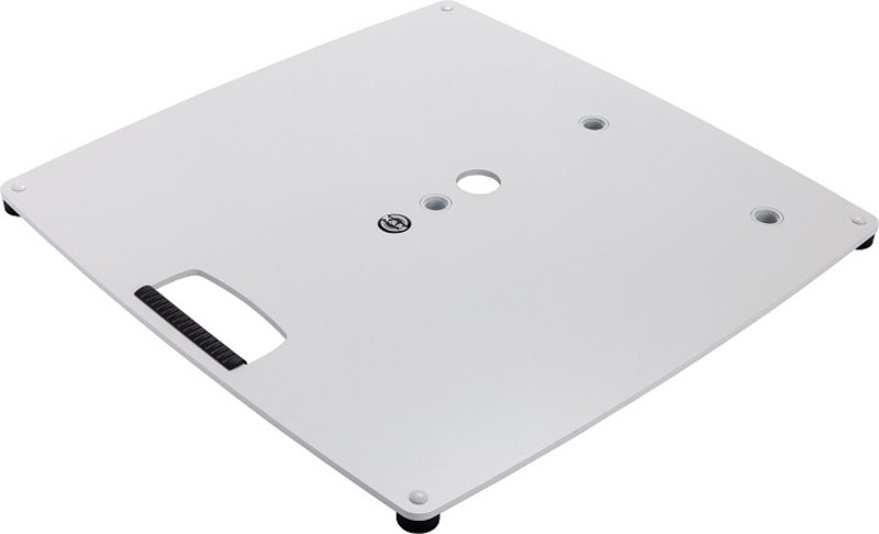 Ergonomisella kantokahvalla varustettu jalustalevy esim. kaiutin -ja valotelineille, joissa on M20-kierre. Tolppa voidaan tarpeen mukaan sijoittaa jalustaan kolmella eri tavalla: keskelle, sivuun tai kulmaan. Neljä huopapintaista tassua erottavat lattian resonassin telineestä ja integoitu kaapelinhallinta lisää jalustan käyttömukavuutta.