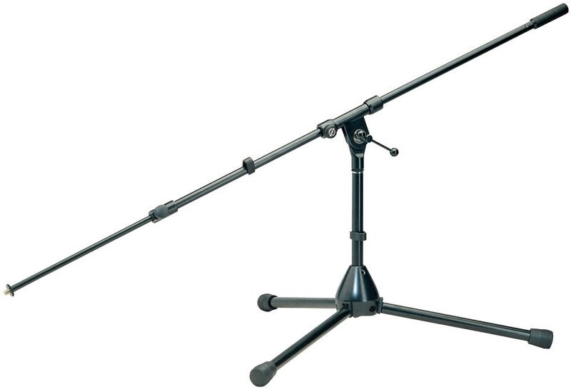 Matala mikrofoniteline, jossa erikoispitkä kaksiosainen teleskooppipuomi. Telineen taitettavat jalat ovat kiinni jämäkässä sinkkivalupohjassa.