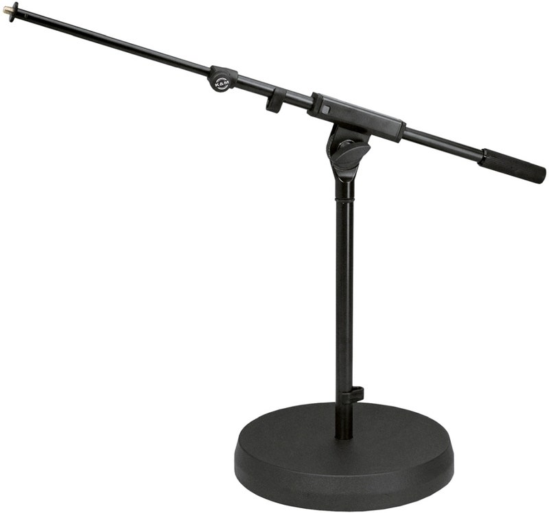 Tuotenumero 1000973Matala puomillinen mikrofoniteline, jossa tuhti valurautainen jalustakiekko tärinänvaimennuksella