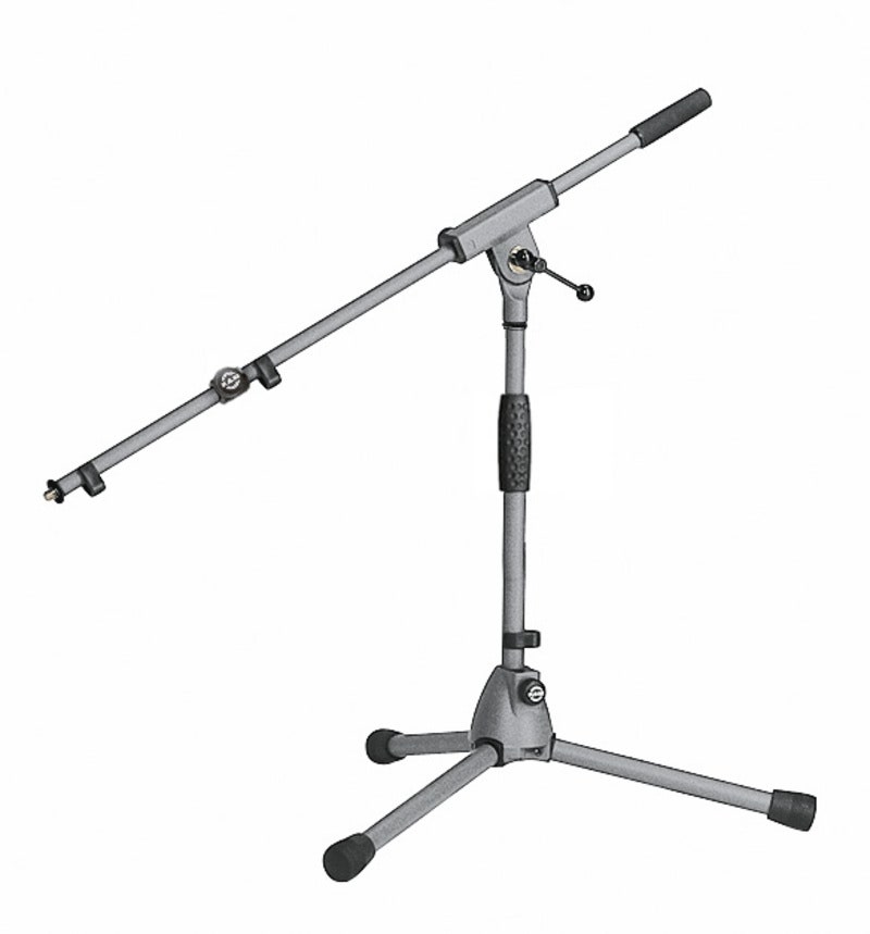 Matala mikrofoniteline, jossa taitettavat jalat. Kaksiosainen teleskooppipuomi tuo lisää ulottuvuutta ja puomin kulman säätö tapahtuu hyvin käteen istuvalla T-ruuvilla.