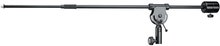 Kromin värinen puomillinen mikrofoniteline, jossa taitettavat jalat ja kaksiosainen teleskooppipuomi