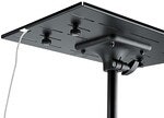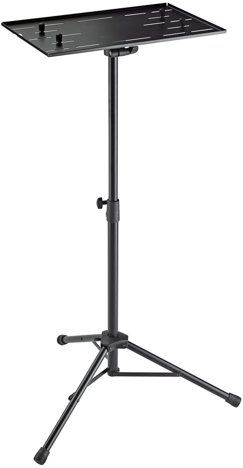 Tukeva ja turvallinen teline kannettavalle tietokoneelle. Tilava taso sopii suurimmalle osalle tämän päivän kannettavista tietokoneista. Säädettävät kiinnityspuristimet pitävät tietokoneen kiinni jalustassa kovassakin menossa. Telineen korkeus on säädettävissä portaattomasti välillä 700mm – 1250mm. Taso irtoaa telineestä vaivattomasti ja kolmijalka taittuu pieneen tilaan kuljetuksen ajaksi.
