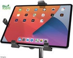 Päällekkäiset kiinnitysleuat integroiduilla kumityynyillä varmistavat turvallisen pidon ja poistavat ei-toivotut tärinä-äänet. Säädettävä kiinnitysosa huopapehmusteella lisää turvallisuutta, kun tabletin pidike on pystysuorassa asennossa ja estää tablettia putoamasta kovassakin menossa. Kätevä siipimutteri mahdollistaa kulman säätämisen, jotta jokainen käyttäjä voi helposti löytää itselleen ihanteellisen katselukulman.