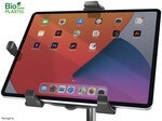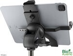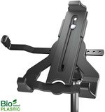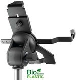 Päällekkäiset kiinnitysleuat integroiduilla kumityynyillä varmistavat turvallisen pidon ja poistavat ei-toivotut tärinä-äänet. Säädettävä kiinnitysosa huopapehmusteella lisää turvallisuutta, kun tabletin pidike on pystysuorassa asennossa ja estää tablettia putoamasta kovassakin menossa. Kätevä siipimutteri mahdollistaa kulman säätämisen, jotta jokainen käyttäjä voi helposti löytää itselleen ihanteellisen katselukulman.