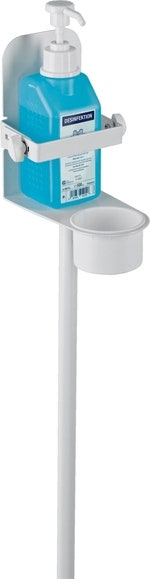 Desinfiointiaineelle ja muille pullotetuille tuotteille suunniteltu teline, jossa on tukeva kiinnike ja keräilyastia. Telineen jalustaputki on päällystetty tyylikkäällä valkoisella puuterimaalilla. Pullotelineen mitat ovat 102mm x 65mm aina 102mm saakka. Desinfiointiaineen pullonkannatin voidaan irrottaa puhdistusta varten. Huomiotavaa on että tämä EI OLE lääketieteellisesti sertifioitu tuote. Desinfiointiaine ei kuulu toimitukseen.