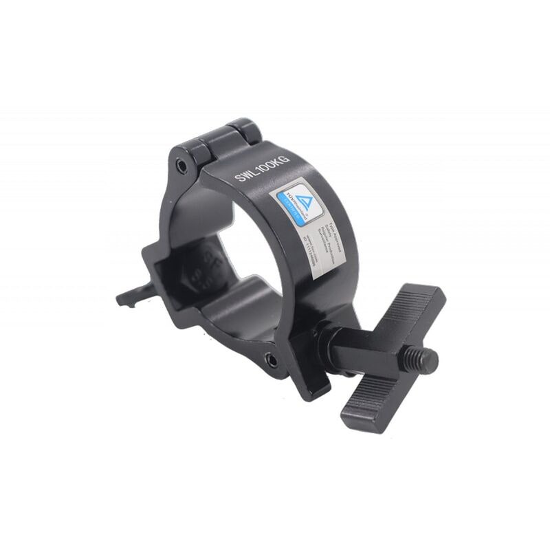 The clamp is compatible with pipe diameters between 48 and 51 mm and has a maximum load capacity of 100 kg. The construction is TÜV Rheinland certified and suitable for safe mounting of stage equipment in various environments.